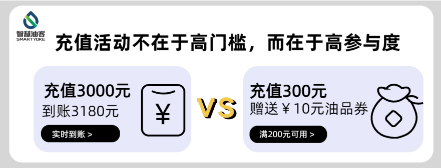 充值活动其实不在于高门槛,而在于高参与度,加油站可以设置3000元的高门槛,也可以设置300元的低门槛,哪个方案更好,要看市场、看客户的选择。
