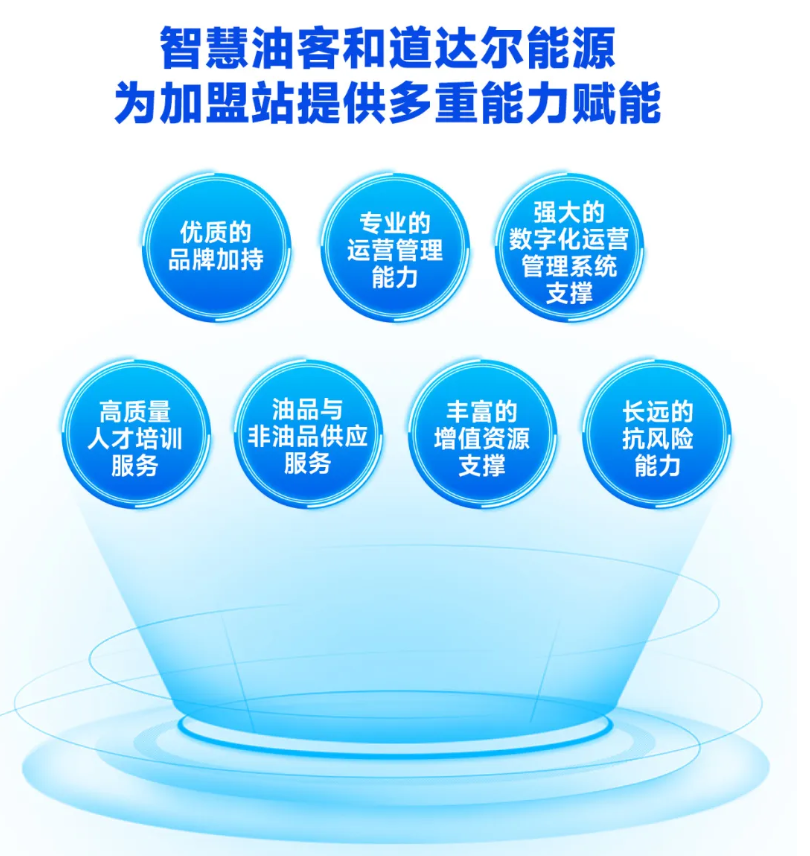 一方面,在数字经济时代,智慧油客为加盟站提供数字化经营系统、营销系统、管理系统、新能源系统、系统运营运维服务以及营销服务等6大赋能,全面提升其经营效率、管理水平以及能源业态拓展能力,在能源企业数字化转型的时代风口,高饱和、高竞争态势的市场环境中,使加盟站具备深挖企业潜在价值的能力,积极拥抱新的能源格局,随时获取与时俱进的加油站运营管理解决方案,激发加盟站的无限潜力,获得更强的综合竞争力。
