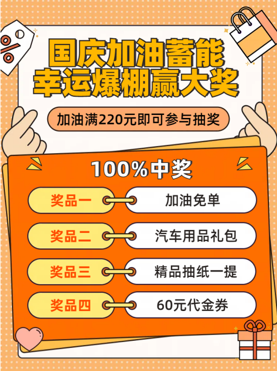 车主每加满220元即可获得一次抽奖机会,奖品包括4张15元油品优惠券、一提精品抽纸、汽车用品礼包、加油免单等,100%中奖。
