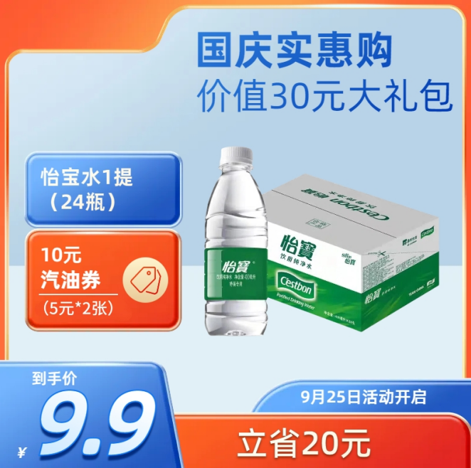 加油满280元,即可9.9元换购30元大礼包(怡宝水1提+10元汽油优惠券)。